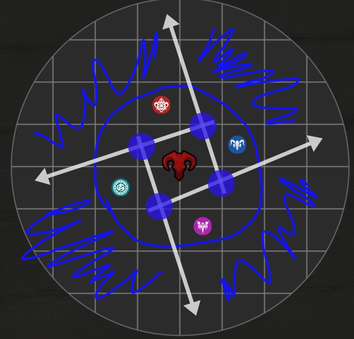 Kazeros sends a beam towards the middle of the map which will slowly travel and stop after a while exploding into a guard pattern at the end. During that Kazeros will charge forward one of the players 3 times and inflict 'blind' on any targets he hits.
